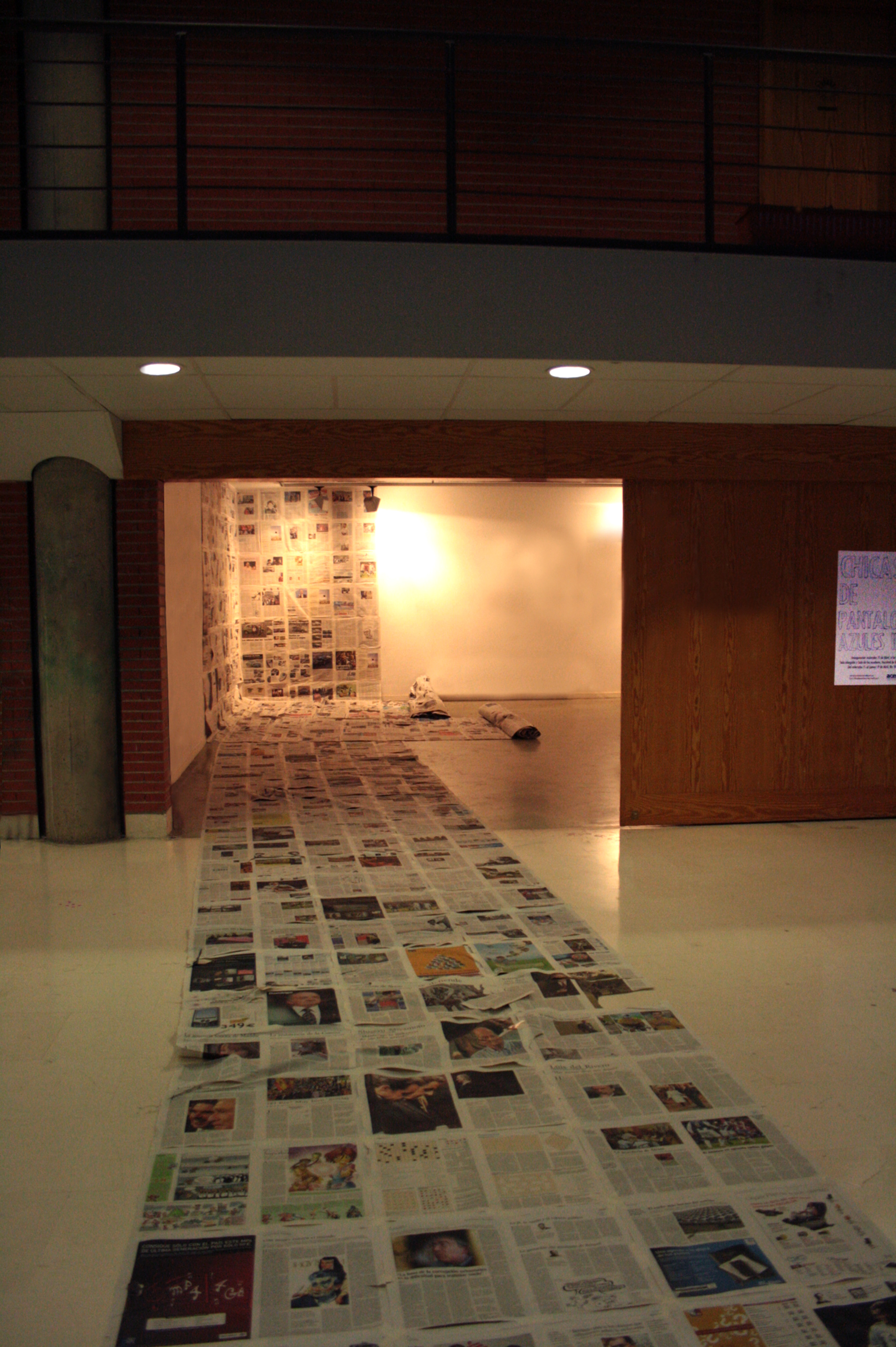 Esta instalación, formaba parte de un proyecto planteado para llevar a cabo en un espacio concreto de la Facultad de Bellas Artes de Cuenca. La instalación venía introducida por un texto en un mural in-situ: la escuela es un aparato ideológico de clase y Estado (Althusser); el pasillo hubiese quedado cubierto por una extensa alfombra de periódicos, resultado de un intenso trabajo de producción, lo cual obligaba a todos los transeúntes en la facultad a sobrepasarlo para poder atravesar el pasillo.